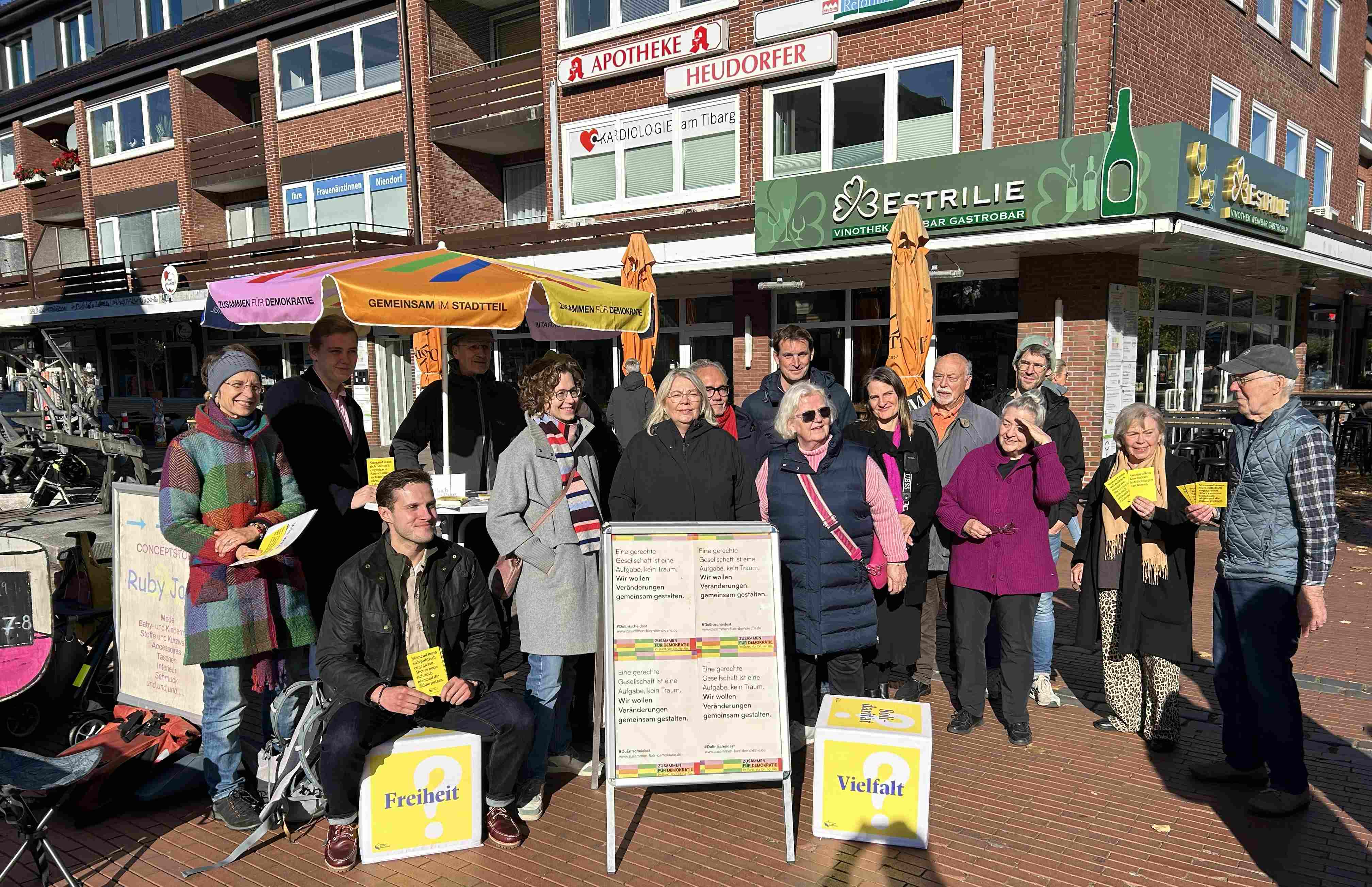 Freiheit, Demokratie, Macht, Solidarität – diese Worte stehen auf einem der beiden großen Schaumstoff-Würfel. Auf dem anderen Würfel stehen Fragen: "Wo begegnest Du in Deinem Alltag...? Was wäre Dein Leben ohne...?" Zusammengewürfelt ergeben sich vielfältige Gesprächsanregungen. Dort unter einem bunten Schirm stehen Vertreter*innen demokratischer Parteien und "Wir für Niendorf" (WfN) und sind gespannt auf die Begegnungen dieses zweiten Demokratie-Standes.